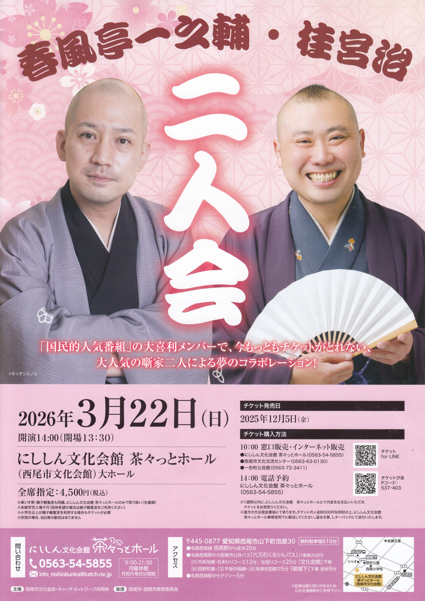 国民的人気番組の大喜利レギュラーとしてお馴染みの落語家、春風亭一之輔さんと桂宮治さんによる二人会が来年3月22日午後2時から、にししん文化会館茶々っとホールで行われる。