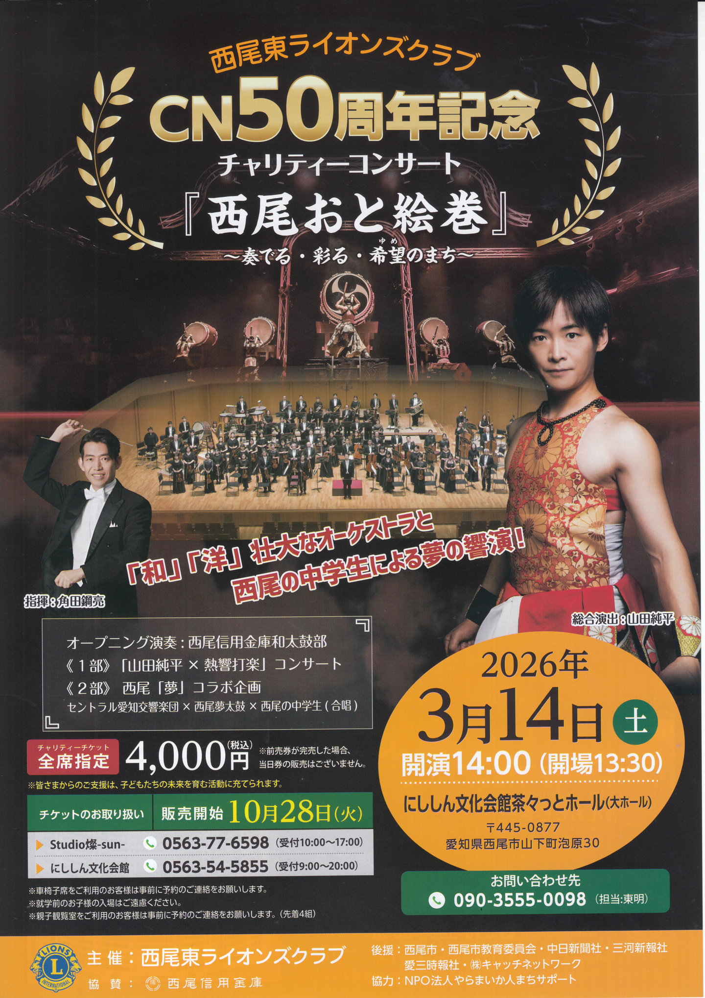 西尾東ライオンズクラブ(杉浦直広会長)の結成50周年記念チャリティーコンサート「西尾おと絵巻~奏でる・彩る・希望(ゆめ)のまち~」(三河新報社など後援)が来年3月14日午後2時から、にししん文化会館茶々っとホールで開かれる。今月28日からチケットの販売が始まる。