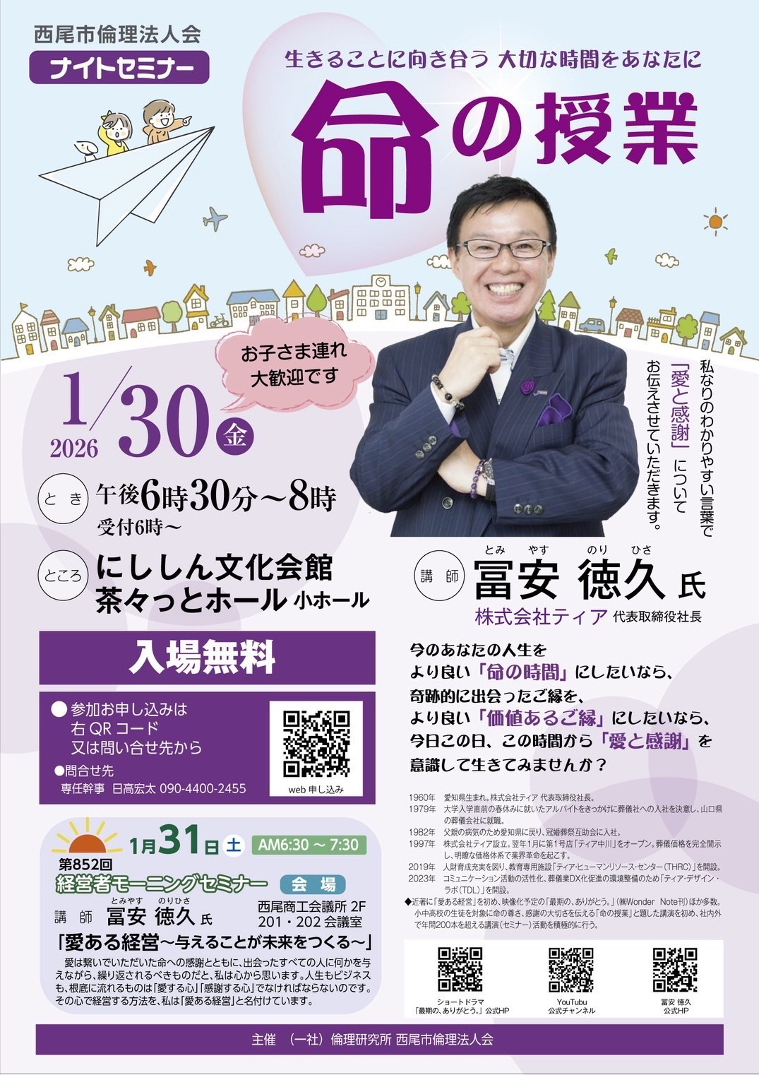 西尾市倫理法人会(松原紗蓮会長)によるナイトセミナー「命の授業」が30日午後6時30分から、にししん文化会館茶々っとホール(小ホール)で開かれる。講師には、葬儀会社のティアで代表取締役社長を務める冨安徳久さんを迎える。